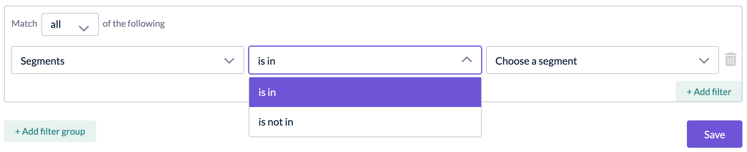 When you’re building a segment, one of the building-block filters you can use is “User is in (or not in) another segment”: