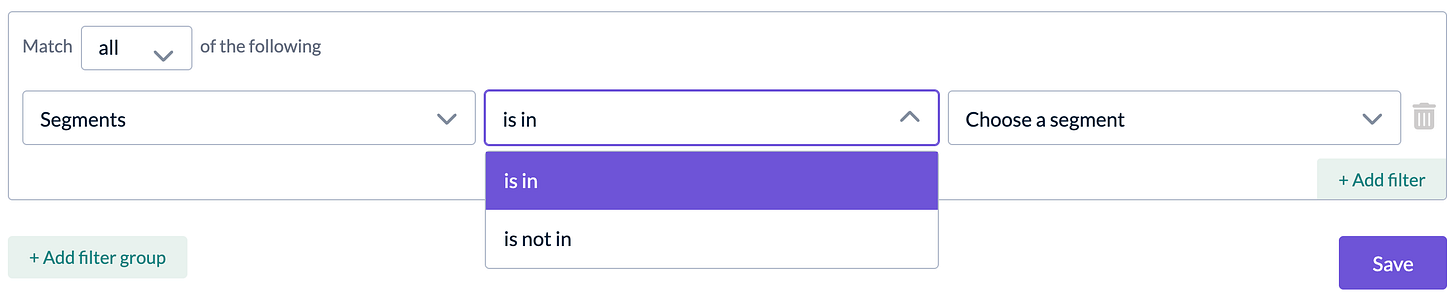 Their segment-building UI calculates subscriber count as you go, so you can adjust your logic, watch the audience go up or down, and repeat until you’re happy: