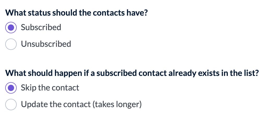 Of course, this is quite important if you’ve already been mailing your contacts — you don’t want to resubscribe the folks who’ve unsubscribed, but you do want to tag them with the appropriate import batch (or whatever else you’re updating via import)